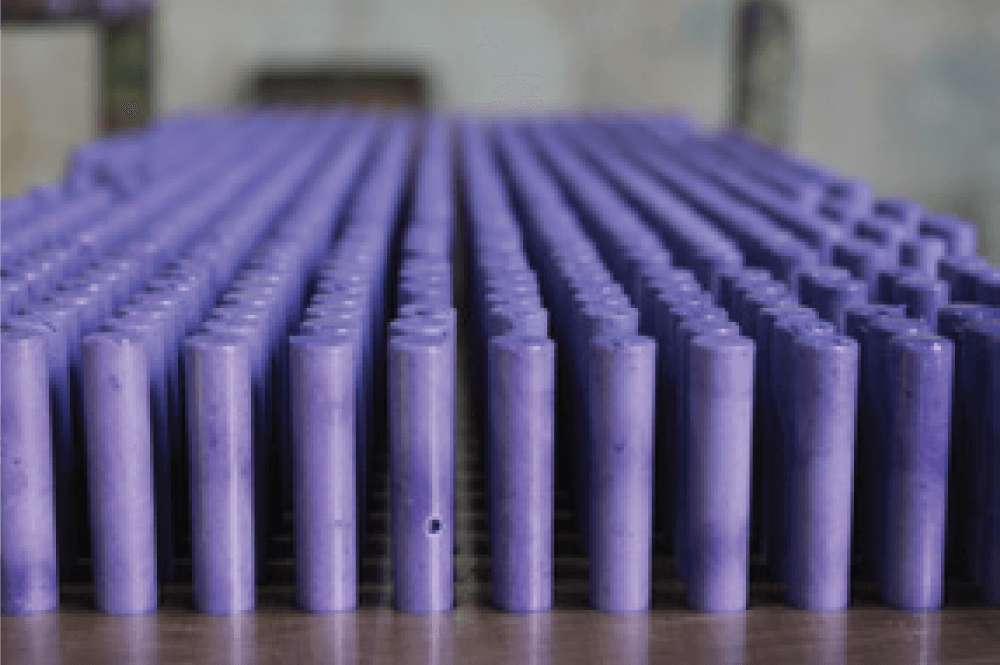 Before the mixture gets too thick, it is poured into a molding machine with many holes that are the exact size and shape of the finished pieces of chalk.