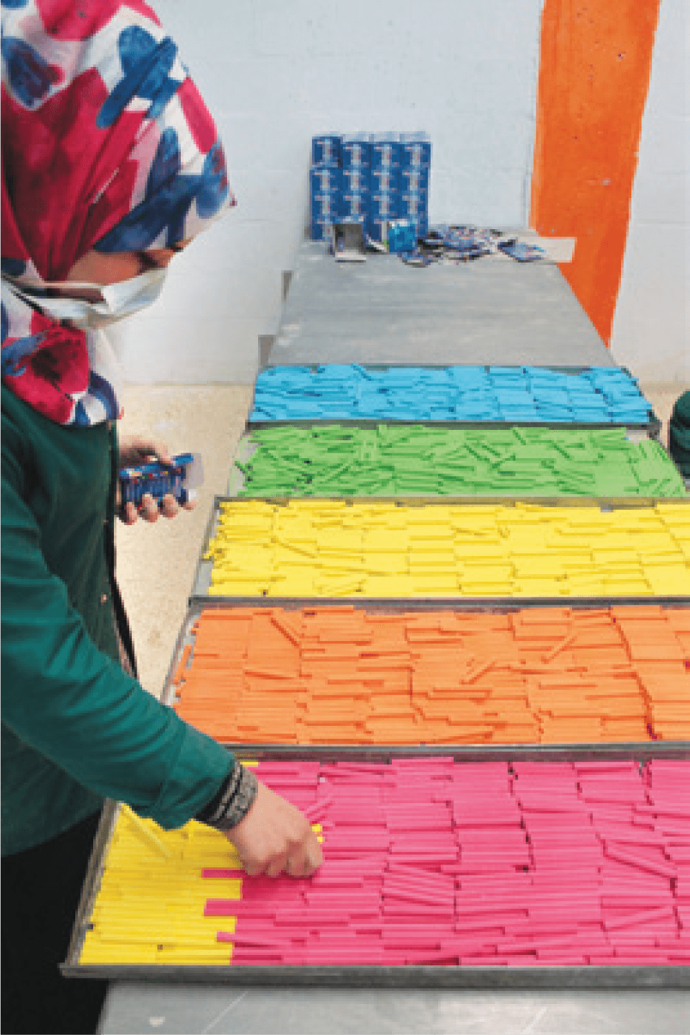 Excess chalk “batter” is scraped off the tops of the moulds, and after a setting of five to eight minutes, depending upon the particular color being manufactured, the sticks of chalk are popped out onto a tray which is then stacked in a large drying rack.