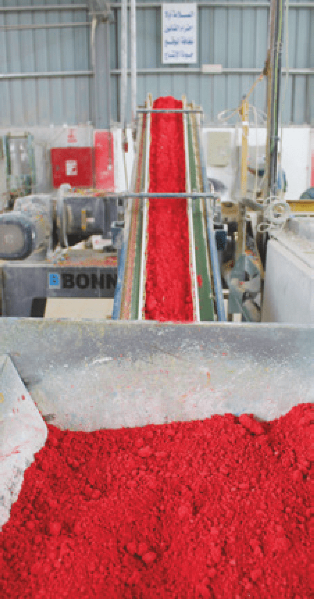 To produce extruded chalk, the makers first stir together, by machine, several white powders. The most important of these is calcium carbonate and water-washed clay. If the chalk is to be colored, the particular color is likewise added in the form of dry, finely ground pigments.